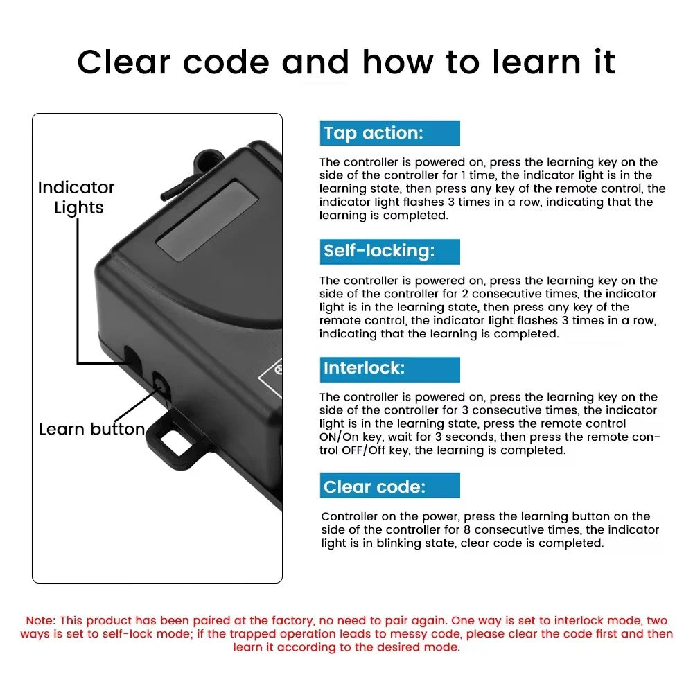 - Easy Setup with Learning & Code Clearing Functions: Quickly pair or reset remotes with one button, no special tools or apps needed.