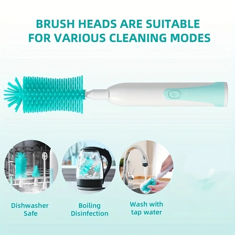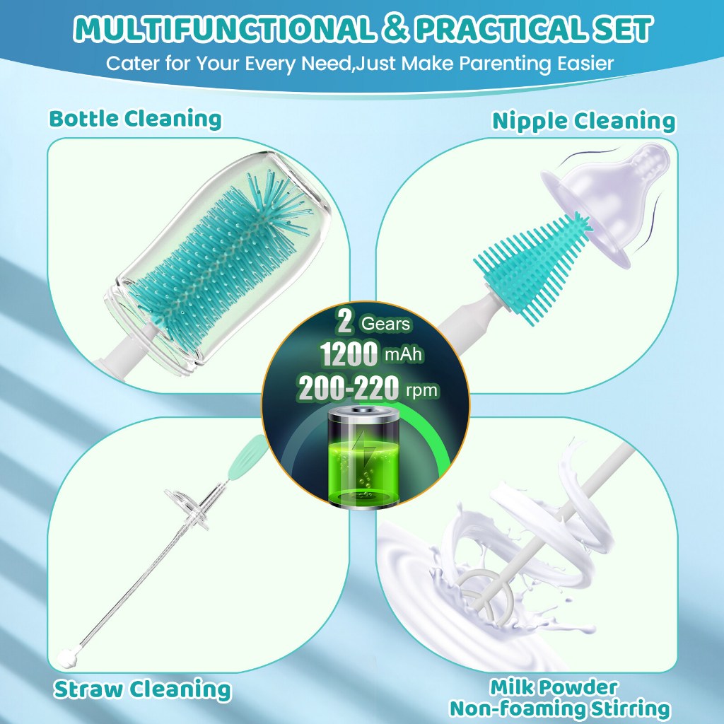 - Complete 6-in-1 Bottle Care: Includes everything you need: electric bottle brush, silicone brush, nipple brush, straw cleaner, milk frother, and travel drying rack.